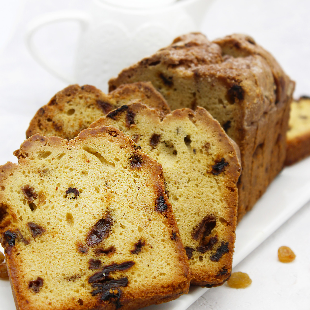 Запашний і солодкий кекс із родзинками зі здобного тіста, дбайливо нарізаний рівномірними скибочками. Декорований цукровою пудрою