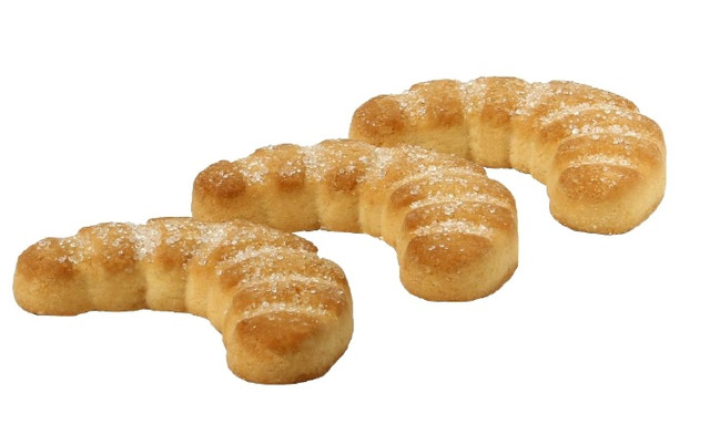 Ці апетитні ласощі у вигляді рогаликів принесуть свято у ваш дім. Випікається печиво в печі на борошні вищого гатунку. У продукті відсутні підсилювачі смаку, консерванти, барвники. Перед випіканням печиво декорується посипаним цукром. Виробнику вдалося досягти ідеального балансу - печиво досить тверде, щоб не ламатися в пачці, але при цьому легко можна відкусити невеликий шматочок і повною мірою насолодитися практично розсипчастим смаком. Спробувавши лише одне печиво, рука відразу ж потягнеться за наступним, дуже вже воно смачне.