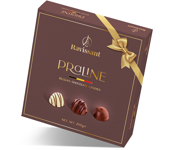 Це абсолютна гармонія білого, молочного і темного шоколаду. PRALINE ТМ Ravissant – апогей мистецтва майстерних шоколатьє та традицій бельгійського шоколадоваріння. Тонкий делікатний смак, високоякісні натуральні компоненти та дизайнерське пакування – три фактори, які роблять PRALINE ідеальним подарунком.
